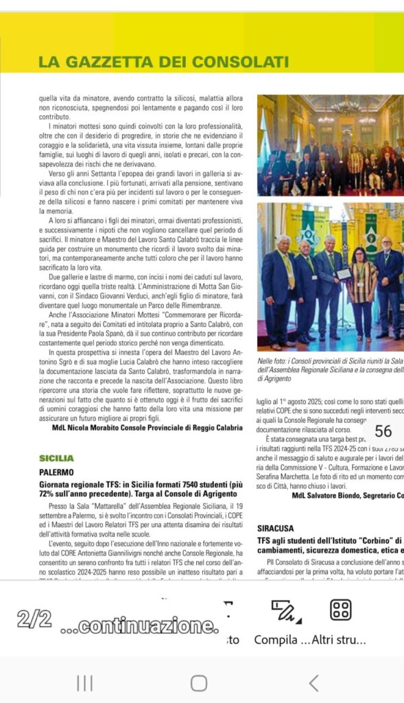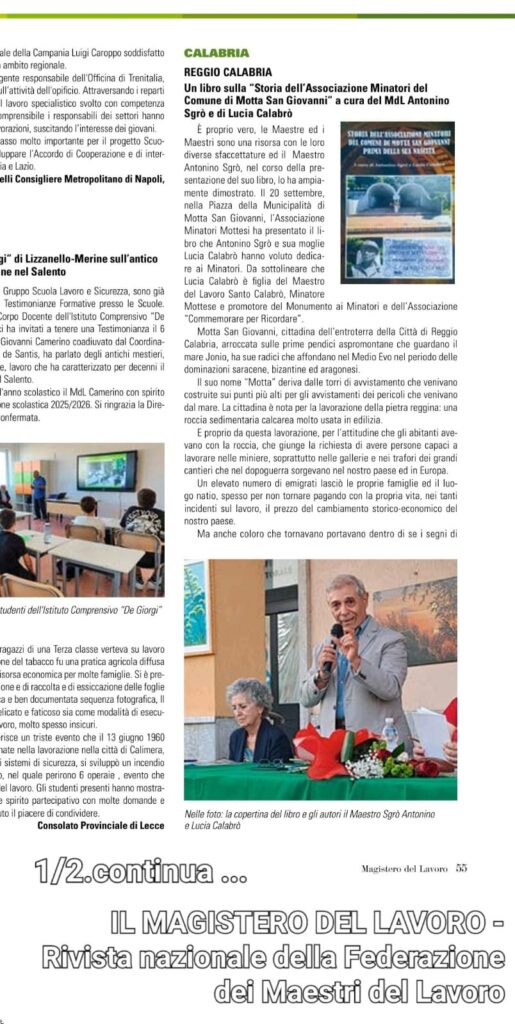 Il Magistero del Lavoro organo ufficiale della Federazione Nazionale Maestri del Lavoro d’Italia ha pubblicato nel suo numero di Settembre 2025 un articolo a firma del Console metropolitano di Reggio Calabria dr. Nicola Morabito, che ringraziamo vivamente per la sua vicinanza ed interesse verso la nostra associazione, sull’evento organizzato il 20 settembre scorso dalla nostra associazione e riguardante la presentazione del libro “Storia dell’Associazione dei minatori del Comune di Motta San Giovanni prima della sua nascita”. Pubblichiamo il testo dell’articolo suddetto e ricordiamo a chiunque ne volesse una copia di contattare l’associazione minatori stessa.